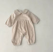 This adorable romper is made with soft corduroy that feels gentle on your little one’s skin. It has a sweet Peter Pan collar and a relaxed, comfy shape that gives plenty of room for movement. The neutral beige tone makes it perfect for everyday wear or special moments. Snaps along the legs make changes easy, and the gathered waist adds a cute, classic touch.