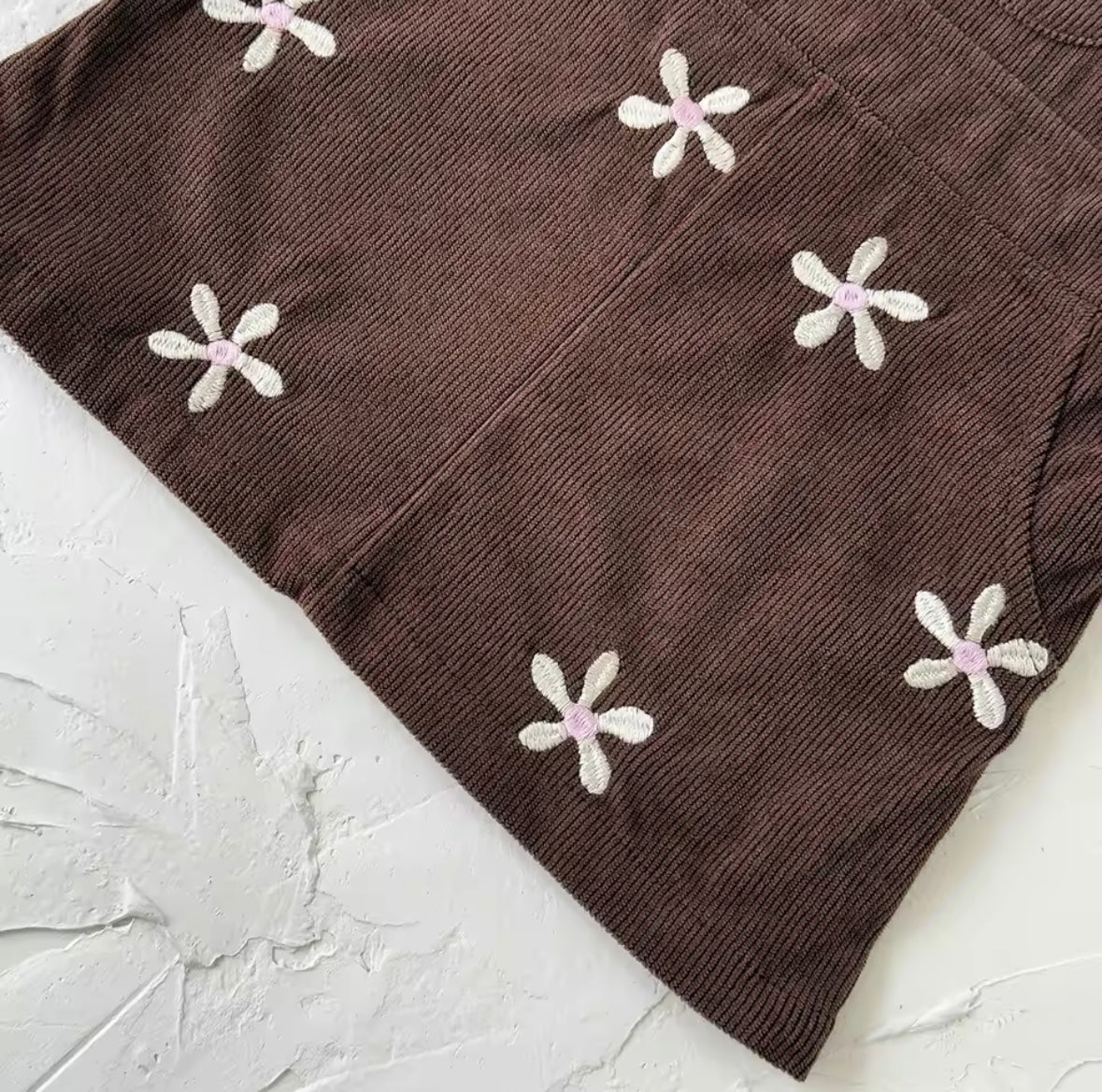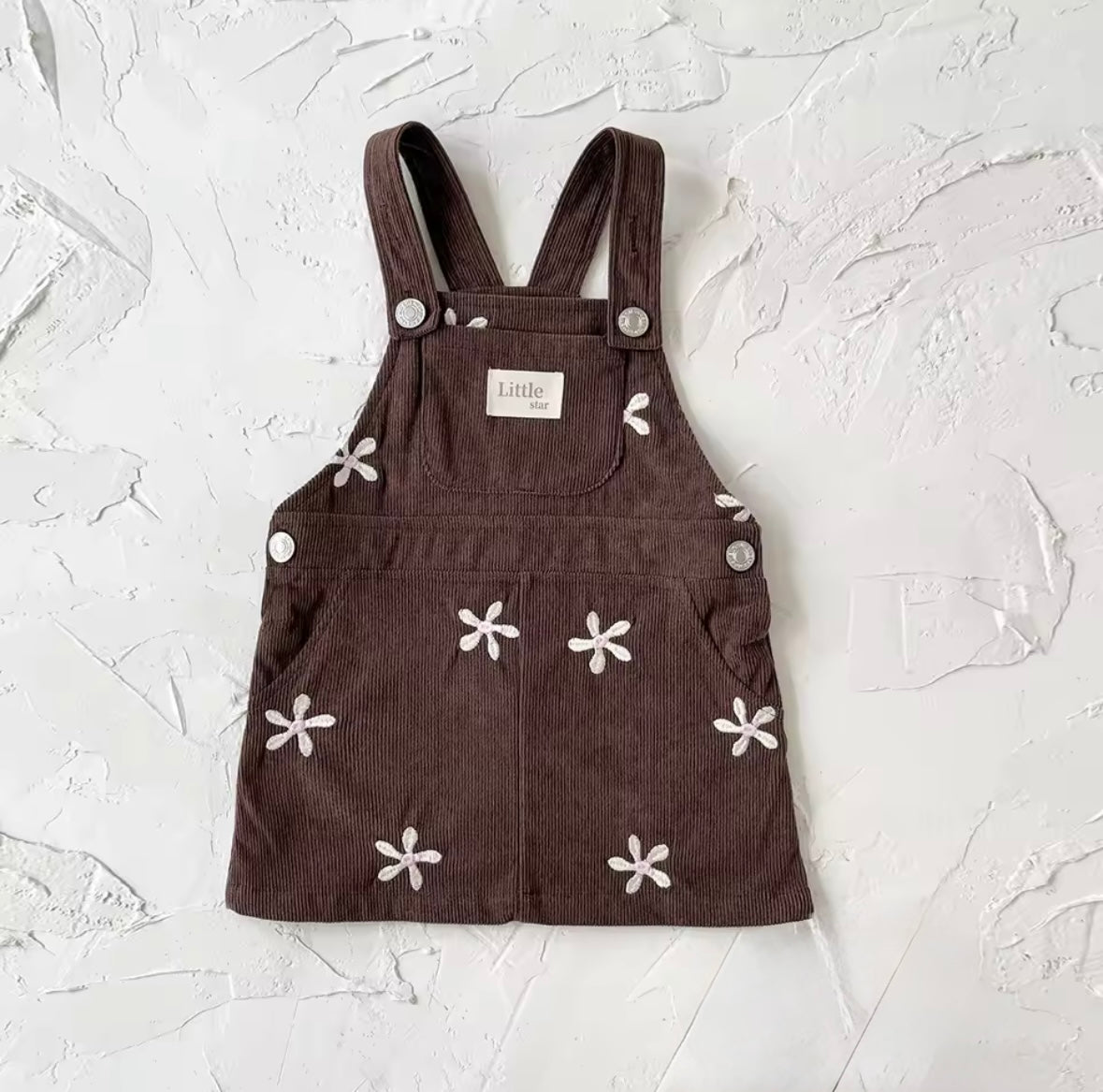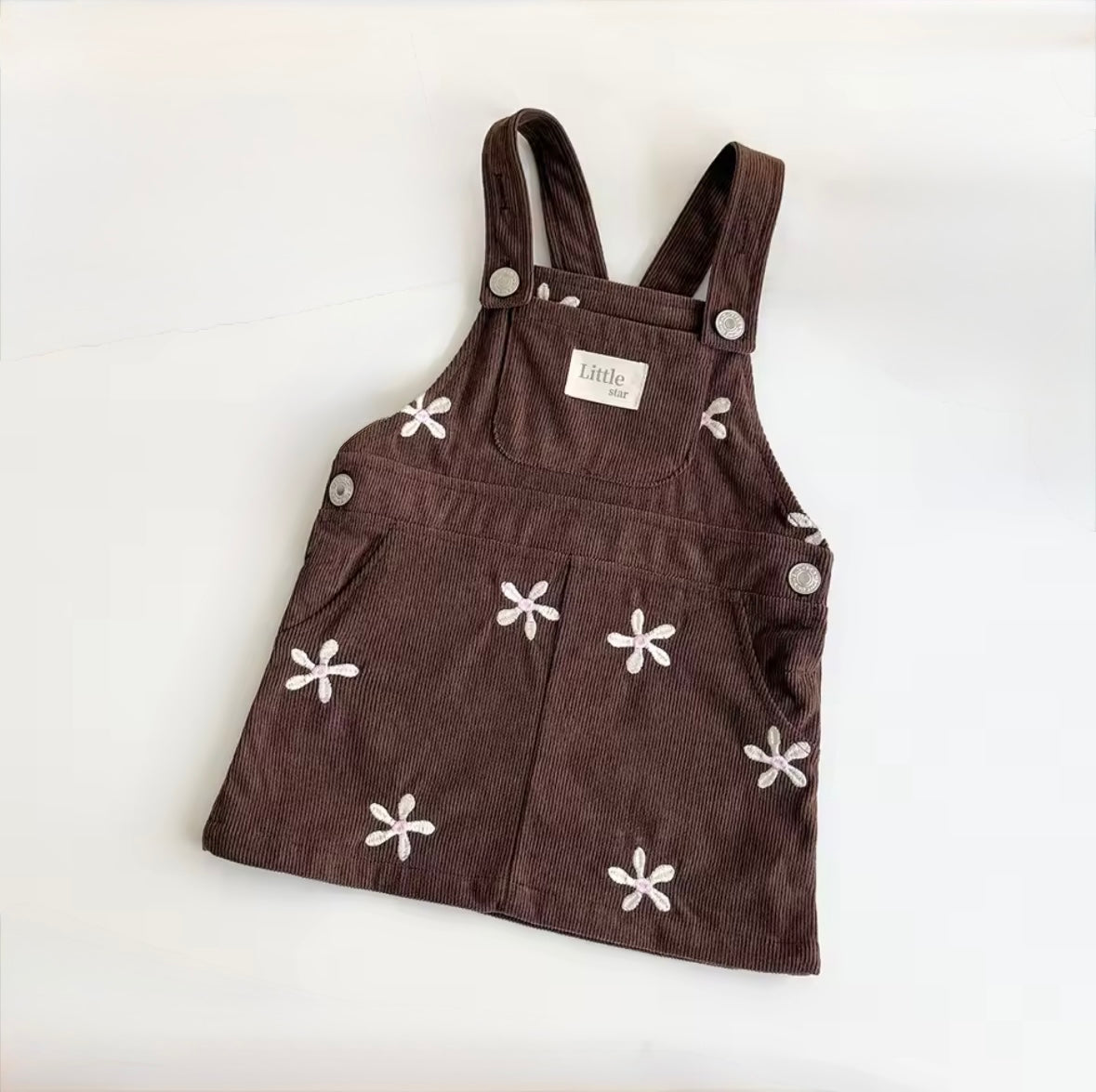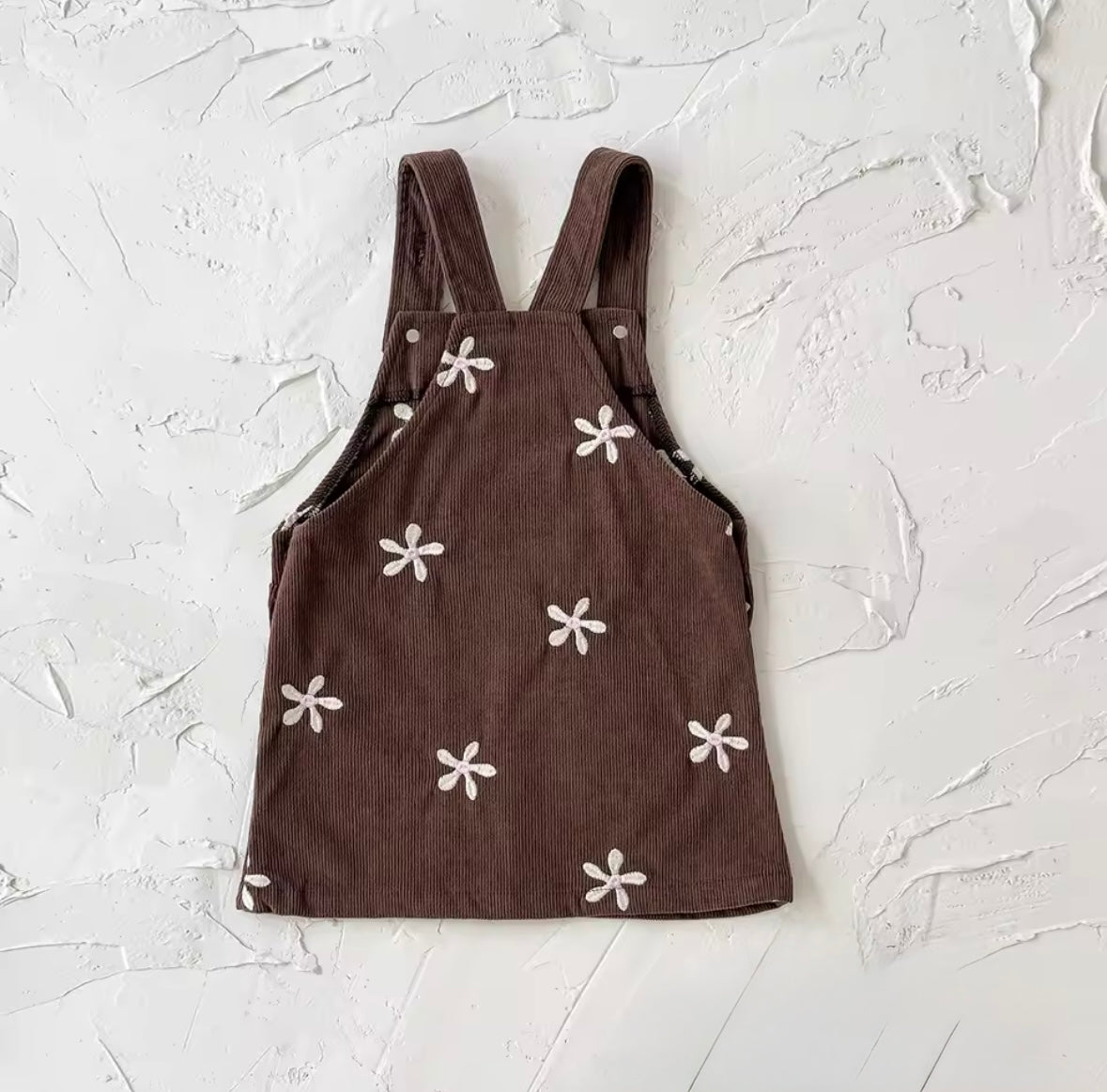 This beautiful corduroy pinafore dress is a timeless little piece designed for everyday adventures and special moments alike. Made from soft brown corduroy, it features delicate embroidered white flowers that add a sweet, playful touch.