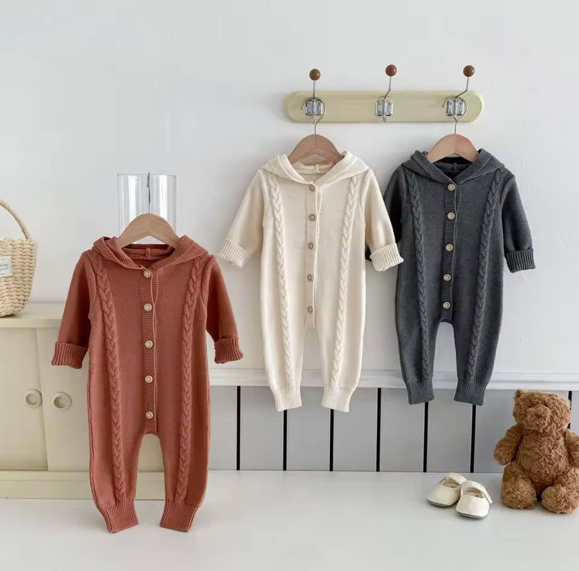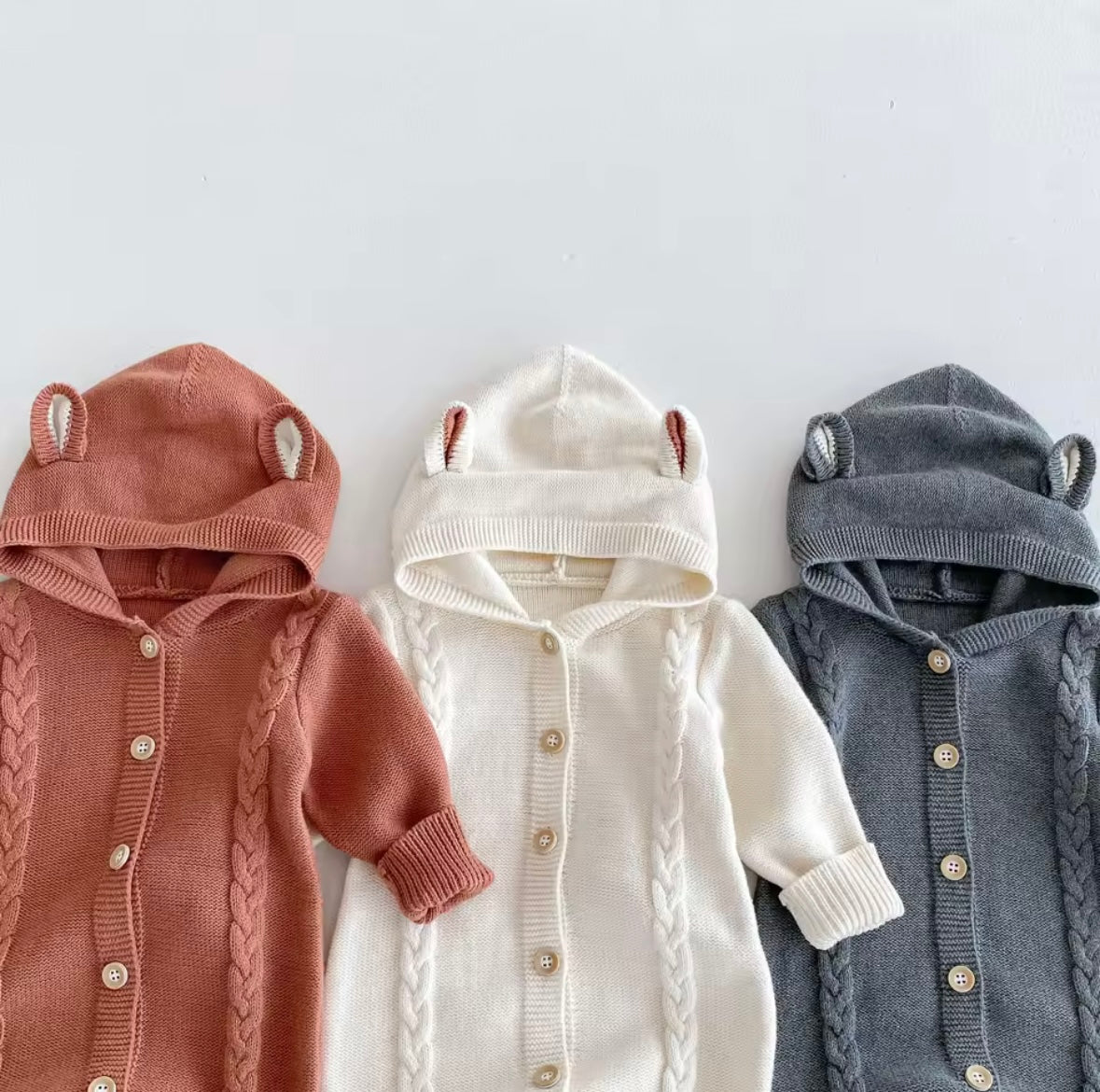 Designed with a classic silhouette, each romper features thoughtful details such as ribbed cuffs for a comfortable fit and a practical button or hooded design, making dressing and changing easy for parents. Perfect for everyday wear, special occasions, or as a thoughtful gift.