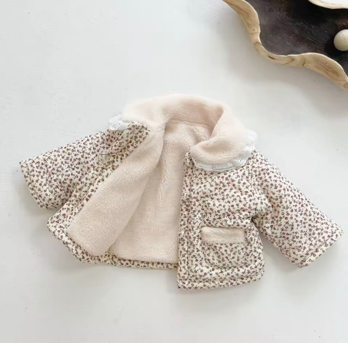 Designed with a relaxed fit for easy layering, it features a sweet rounded collar with subtle lace detail and a handy front pocket for extra charm. The plush lining adds warmth without feeling bulky, making it ideal for everyday wear, walks, or special outings.