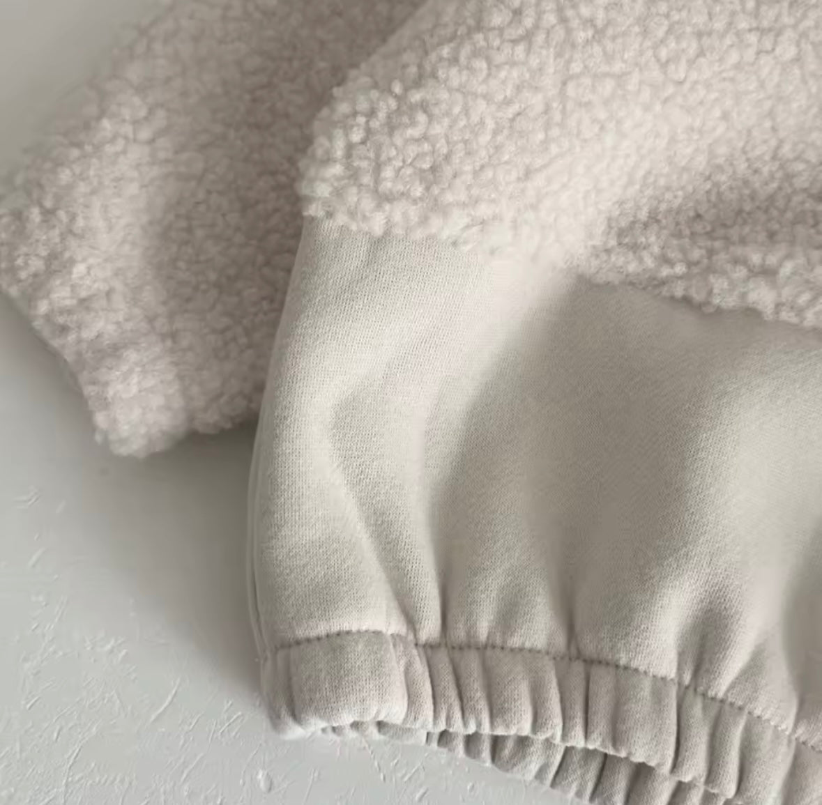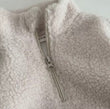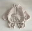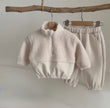 This cosy two piece set is perfect for little ones who love comfort. The top has a soft teddy fleece texture and a handy half zip that makes getting dressed quick and easy. The bottom half of the top and the matching joggers are made from a smooth cotton blend that feels gentle on the skin. Both the top and trousers have stretchy edges so the fit stays snug without feeling tight.